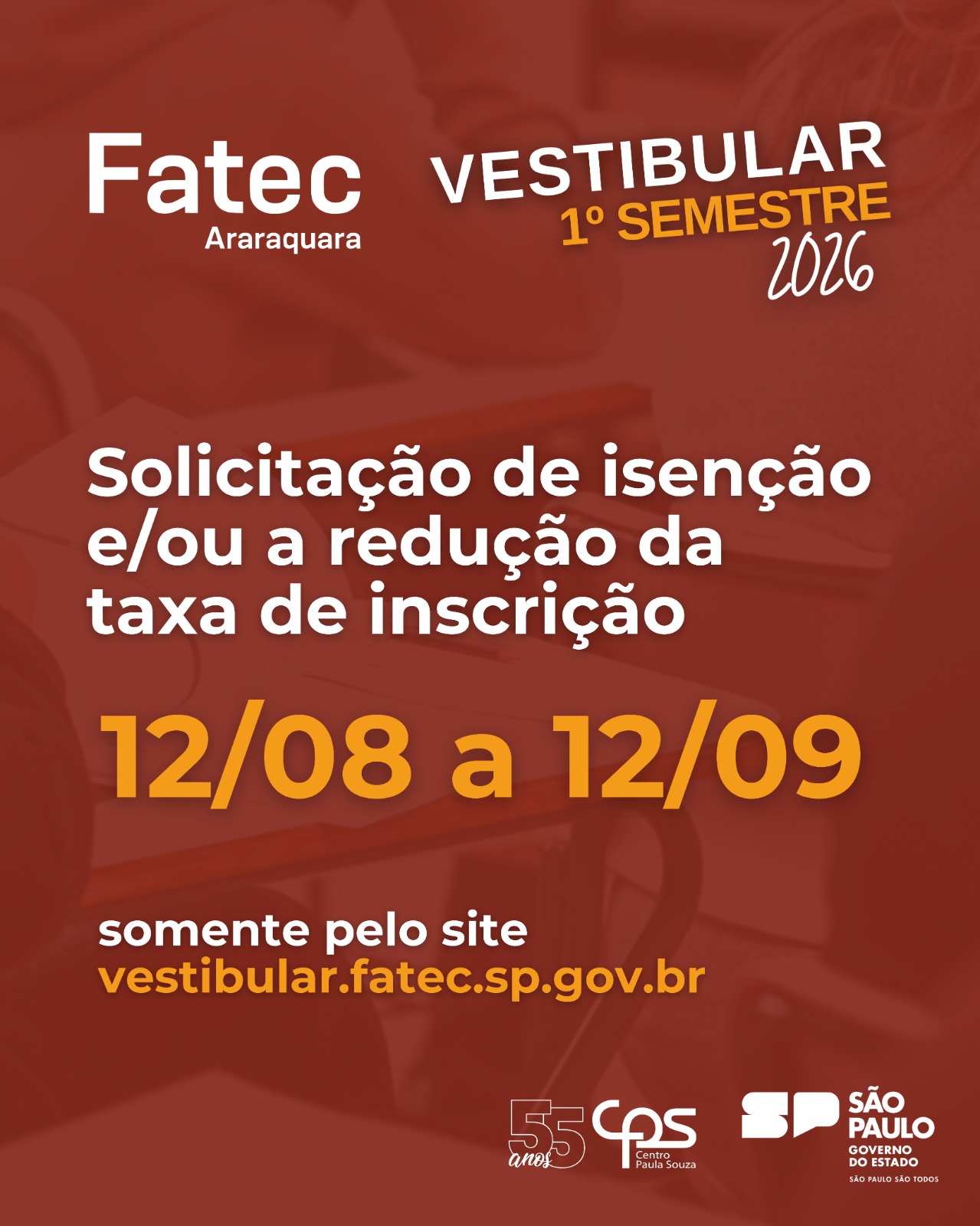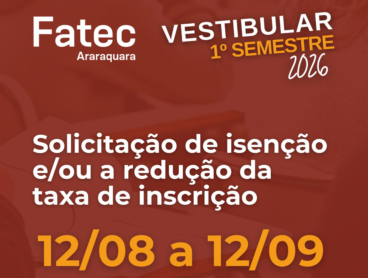 Terá início nesta terça-feira (12) o período para solicitar isenção total e redução de 50% do valor da taxa de inscrição do vestibular da Faculdade de Tecnologia (Fatec) de Araraquara. A oportunidade é voltada a jovens de baixa renda ou em vulnerabilidade socioeconômica que atendam, cumulativamente, a critérios de escolaridade e renda. O prazo vai até o dia 12 de setembro.