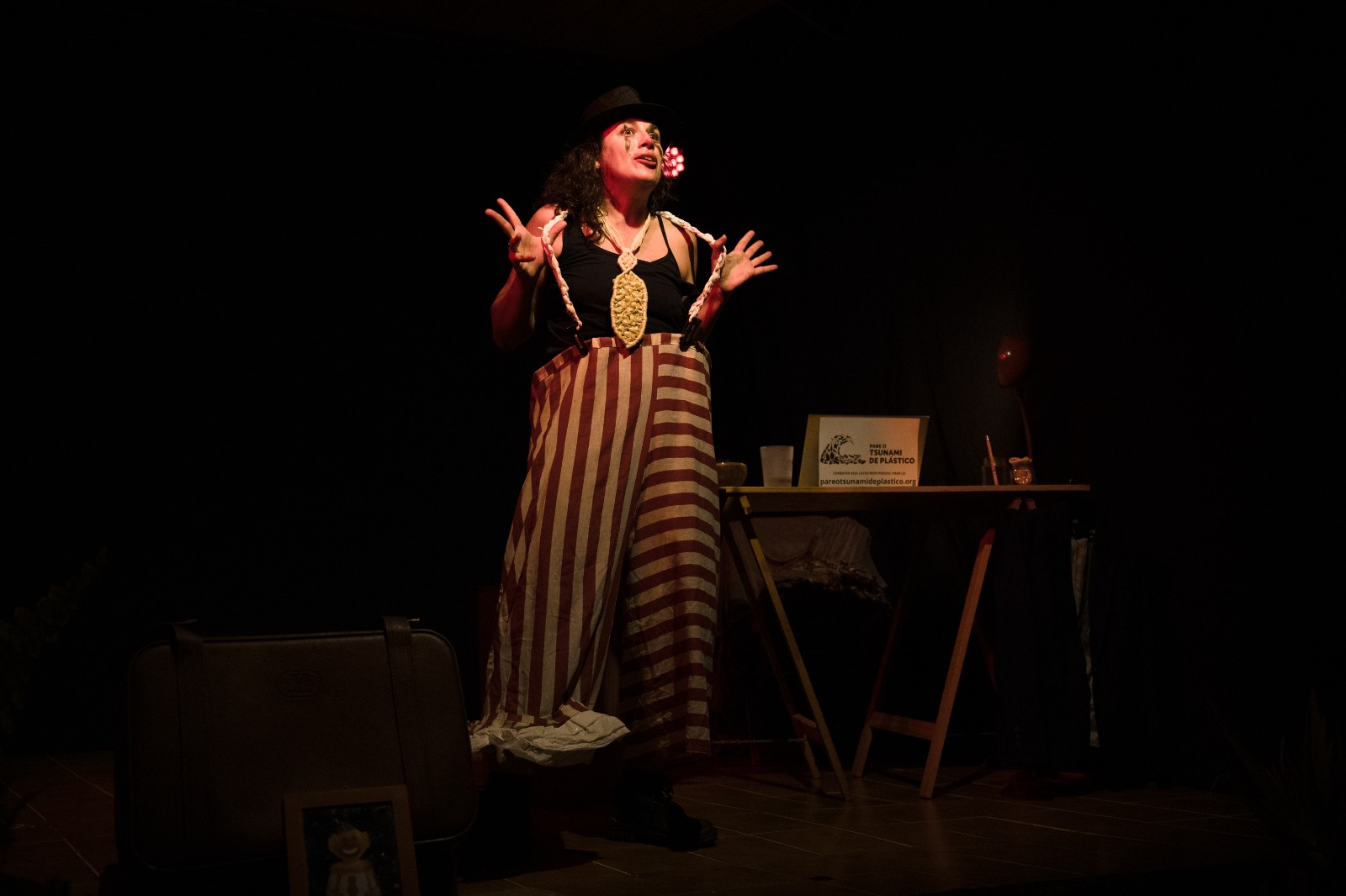 “Nesta conferência performativa vamos tentar olhar a tragédia nos olhos, mas também vamos nos divertir”, aponta Pamella. “Esse espetáculo propõe uma ginástica do imaginar. Vamos tentar olhar a tragédia nos olhos, perceber algo que sustenta nosso estilo de vida, mas que é quase invisível. Vamos encontrar personagens humanas e não-humanas. Máscaras sociais e teatrais. Convites ao nosso imaginário, para viagens no tempo e na história dessa matéria tão abundante, comum e mágica: o plástico.”