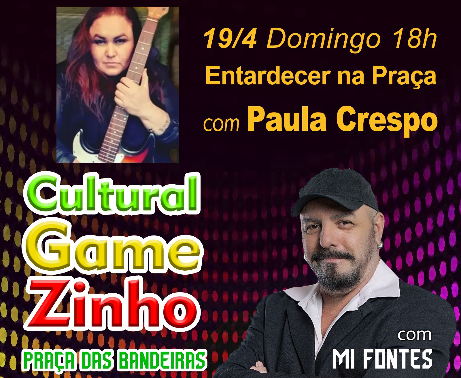 A Praça das Bandeiras apresenta mais um show musical gratuito na programação do projeto “Ponto de Cultura”: será neste domingo (19), das 18h às 20h, com a cantora Paula Crespo.