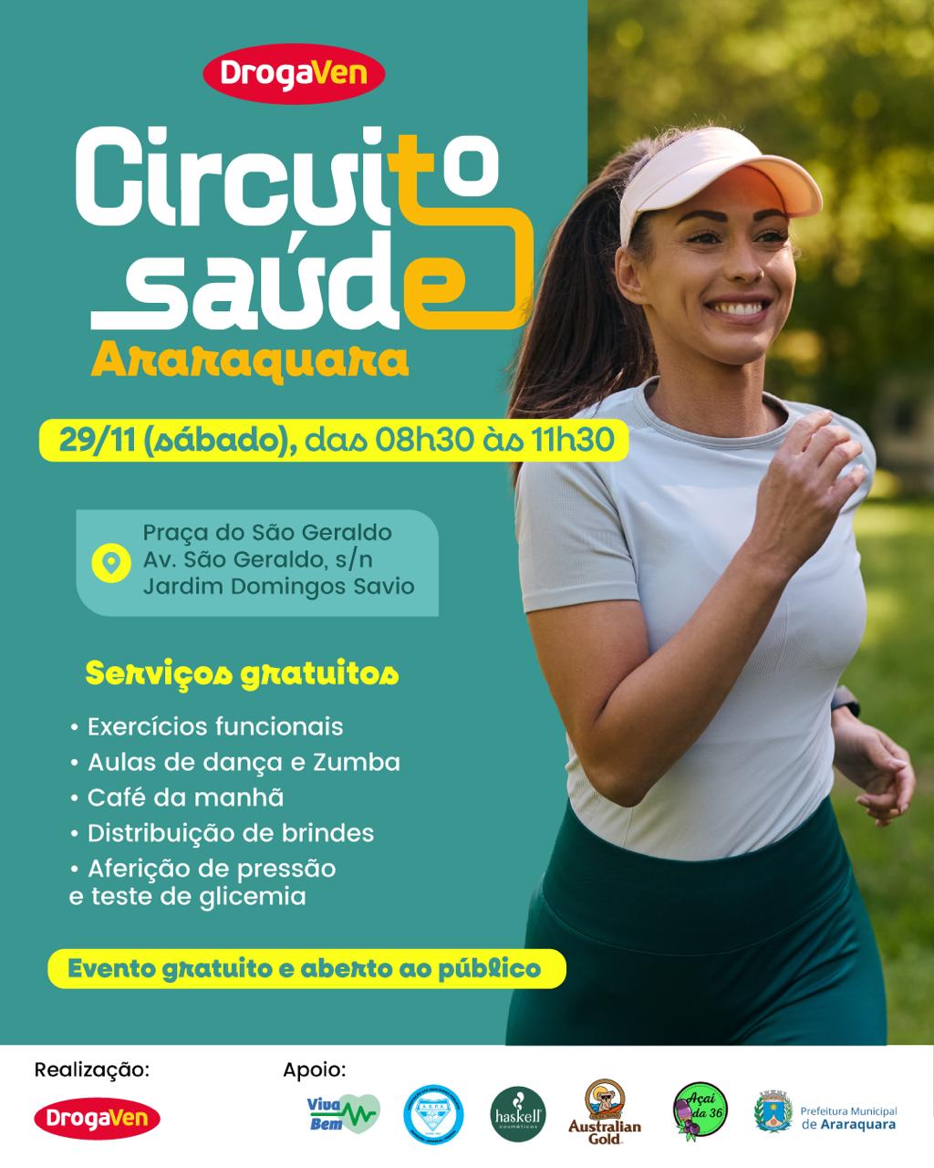 Com apoio de empresas parceiras e instituições, como DrogaVen e ASPA, a Prefeitura promove mais uma edição do Circuito Saúde, em Araraquara, oferecendo atrações e serviços gratuitos.