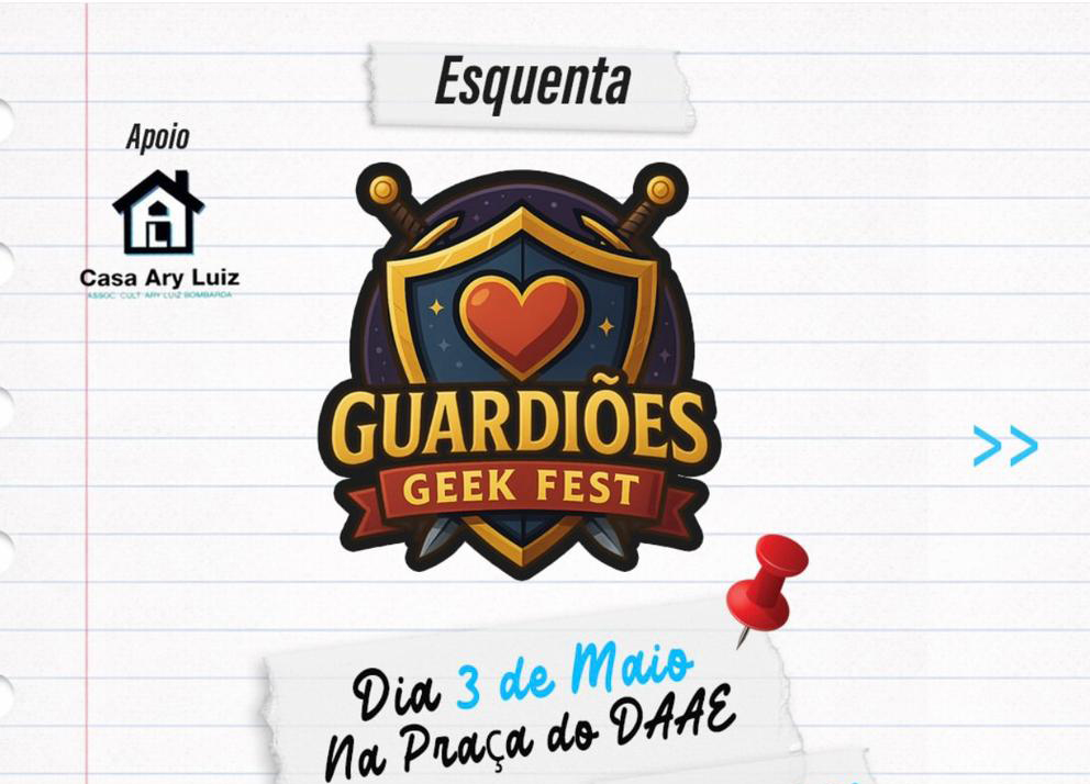 O Esquenta do Guardiões Geek Fest será realizado neste domingo, 3 de maio, na Praça do Daae – Fonte Luminosa, das 16h às 19h. O evento gratuito tem o apoio da Secretaria Municipal de Cultura e Fundart e reúne uma programação leve, divertida e pensada para toda a família.