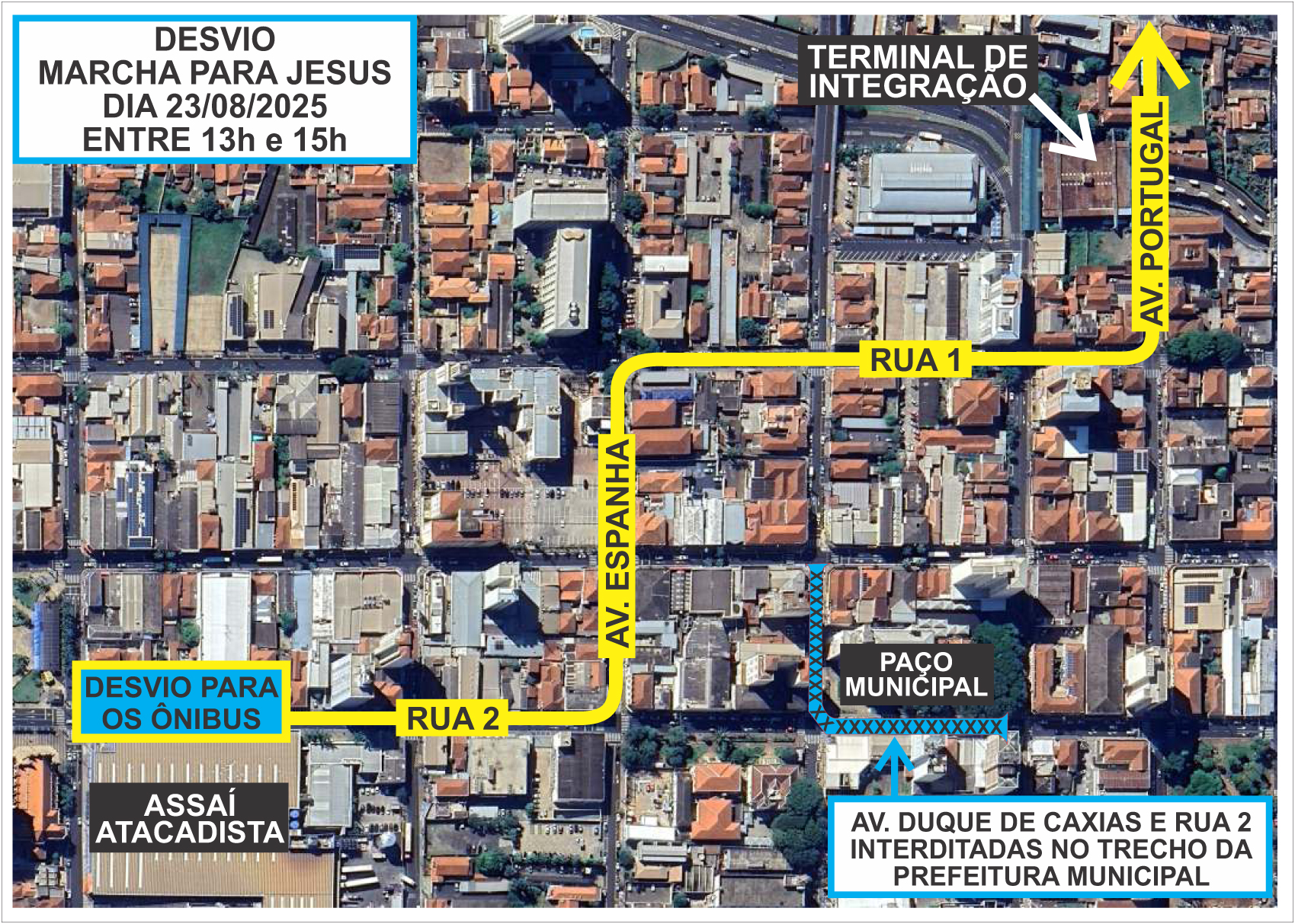 A Prefeitura de Araraquara, por meio da Secretaria Municipal de Assuntos de Segurança e Mobilidade Urbana, informa que no próximo sábado (23), haverá interdições temporárias em vias da região central em função da realização da Marcha para Jesus, evento que integra a programação dos 208 anos de Araraquara.