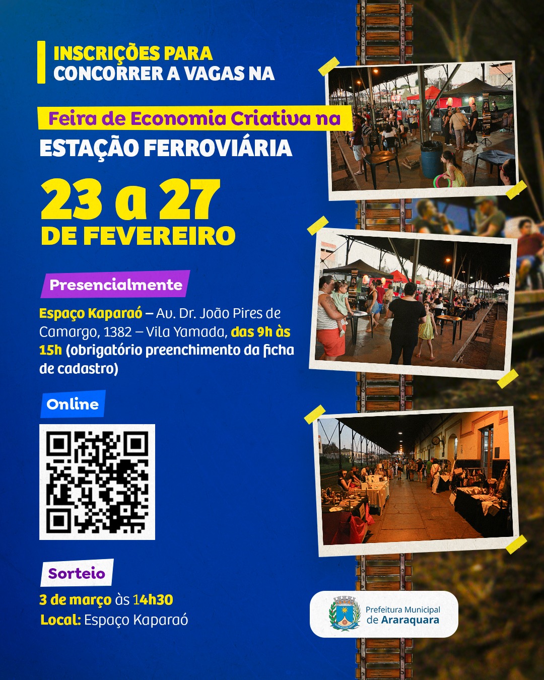 A Prefeitura de Araraquara, por meio da subsecretaria do Trabalho e da Economia Criativa e Solidária da Secretaria Municipal de Desenvolvimento Econômico, lançou um Edital de Chamamento Público que traz informações sobre as inscrições de empreendedores para o sorteio de vagas para a Feira Municipal de Economia Criativa e Solidária. Podem se inscrever para o evento na Estação Ferroviária os empreendedores devidamente cadastrados na subsecretaria. As inscrições devem ser feitas entre os dias 23 e 27 de fevereiro, por meio do formulário eletrônico disponível no link