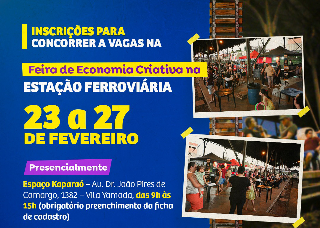 A Prefeitura de Araraquara, por meio da subsecretaria do Trabalho e da Economia Criativa e Solidária da Secretaria Municipal de Desenvolvimento Econômico, lançou um Edital de Chamamento Público que traz informações sobre as inscrições de empreendedores para o sorteio de vagas para a Feira Municipal de Economia Criativa e Solidária. Podem se inscrever para o evento na Estação Ferroviária os empreendedores devidamente cadastrados na subsecretaria. As inscrições devem ser feitas entre os dias 23 e 27 de fevereiro, por meio do formulário eletrônico disponível no link