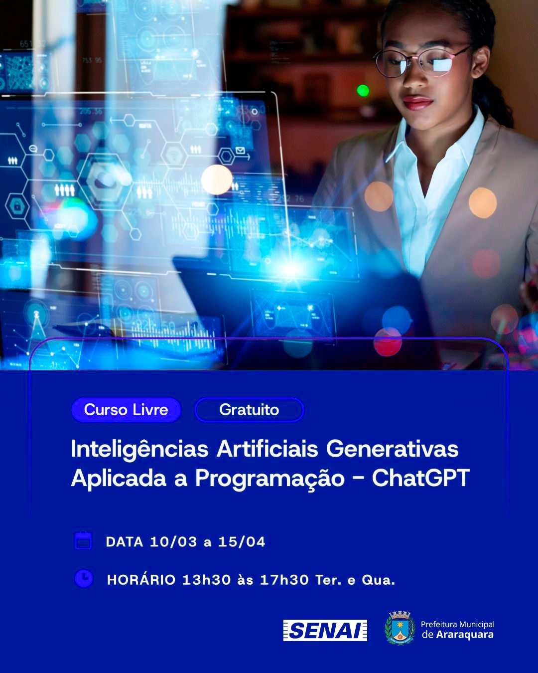 A Prefeitura de Araraquara, em parceria com o Serviço Nacional de Aprendizagem Industrial (SENAI), está com matrículas abertas para o curso gratuito Inteligências Artificiais Generativas Aplicadas à Programação – ChatGPT, com carga horária de 48 horas.