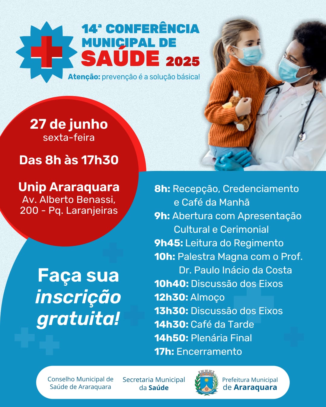 A Prefeitura de Araraquara realiza nesta sexta-feira (27) a 14ª Conferência Municipal de Saúde, um dos principais espaços de participação social na definição das políticas públicas do setor. O evento, organizado pela Secretaria Municipal de Saúde e pelo Conselho Municipal de Saúde, acontece na Unip e é aberto a toda população residente em Araraquara com idade a partir de 16 anos.