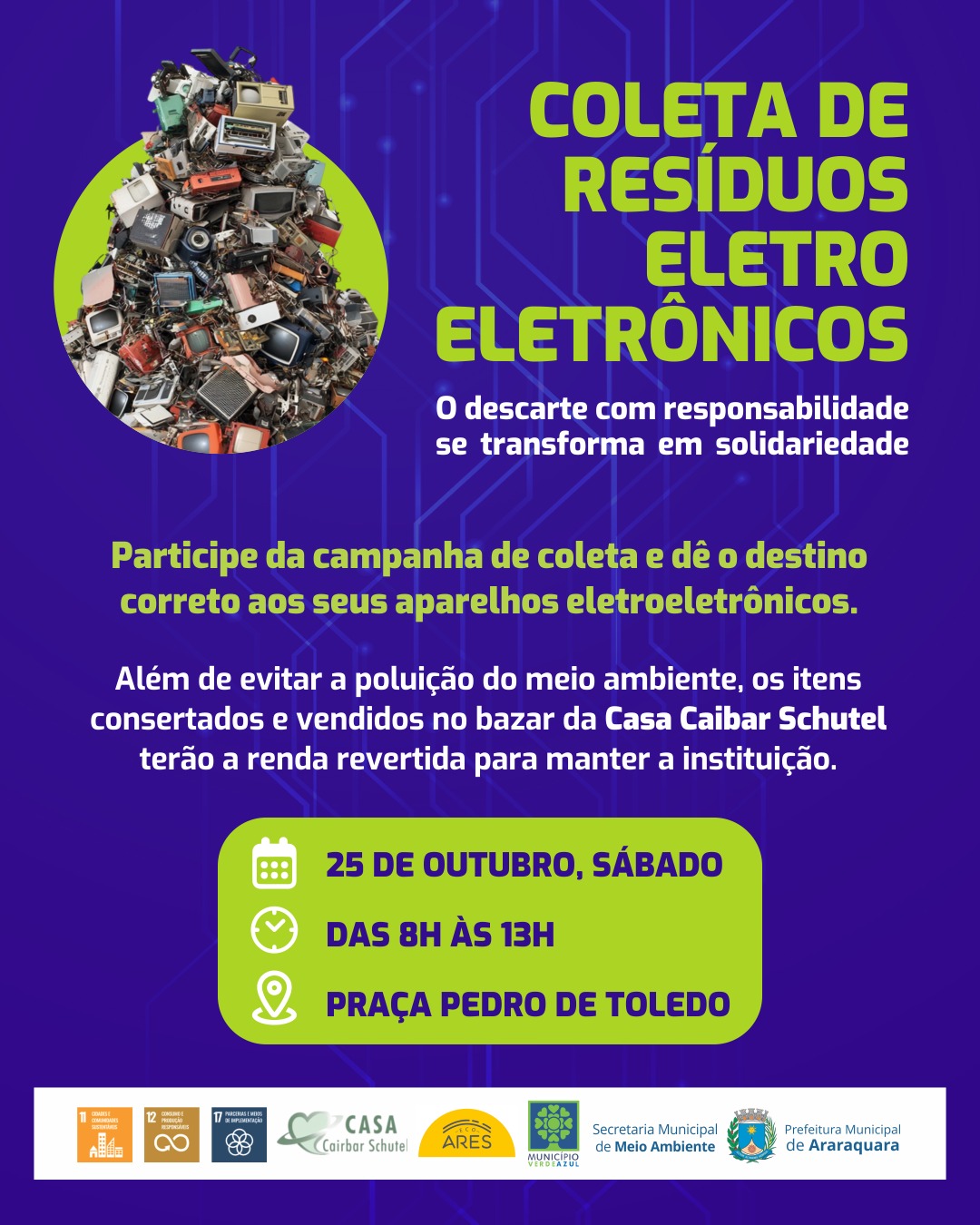 A Prefeitura de Araraquara, por meio da Secretaria de Meio Ambiente, realizará no próximo dia 25, das 8h às 13h, a 2ª Campanha de Coleta de Resíduos Eletroeletrônicos de 2025 na Praça Pedro de Toledo. A ação é fruto da parceria do poder público com a EcoARES e a Casa Cairbar Schutel.