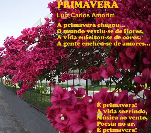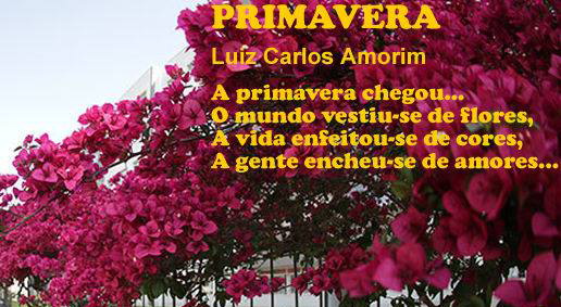 Eu ia escrever sobre o Dia da Árvore, que já passou, mas como essa instituição de vida tem tudo a ver com a primavera, que acabou de começar, vamos falar da estação mais bonita do ano. E não foi só pelas flores tantas a enfeitar os caminhos que me dei conta que a primavera chegou. Minha amiga Irene, do Rio Total, envia mensagem me perguntando o que houve com minha página em Escritores e Poetas daquele portal, pois conta com mais de duas mil visitas. Numa de ano anterior, foram mais de cinco mil visitas. Fiquei tão feliz com o sucesso de meus poemas sobre a primavera, que resolvi falar da nova estação.