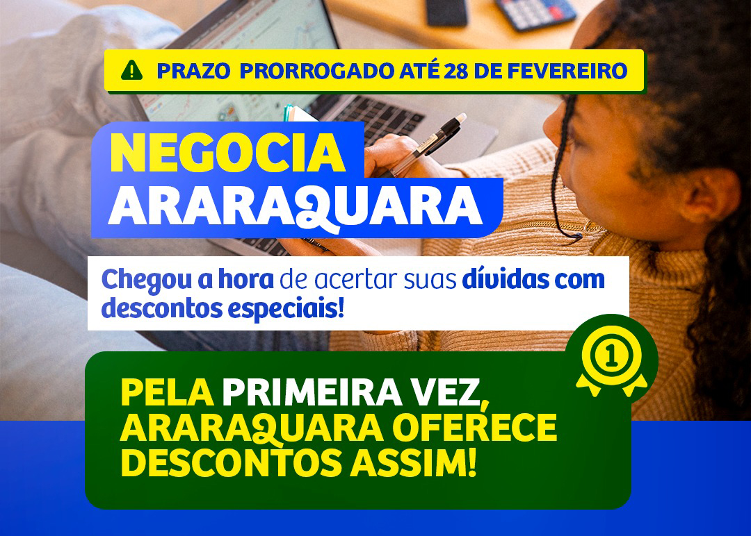 A Prefeitura de Araraquara publicou na sexta-feira (30) um novo edital de prorrogação do prazo de vigência do programa “Negocia Araraquara”, iniciativa inédita de regularização de débitos fiscais dos contribuintes. O prazo para quem deseja quitar dívidas junto ao poder público municipal com desconto foi prorrogado até o dia 28 de fevereiro de 2026, a fim de possibilitar maior adesão. O edital também foi ratificado: os parcelamentos firmados na transação tributária terão a incidência somente de correção monetária.