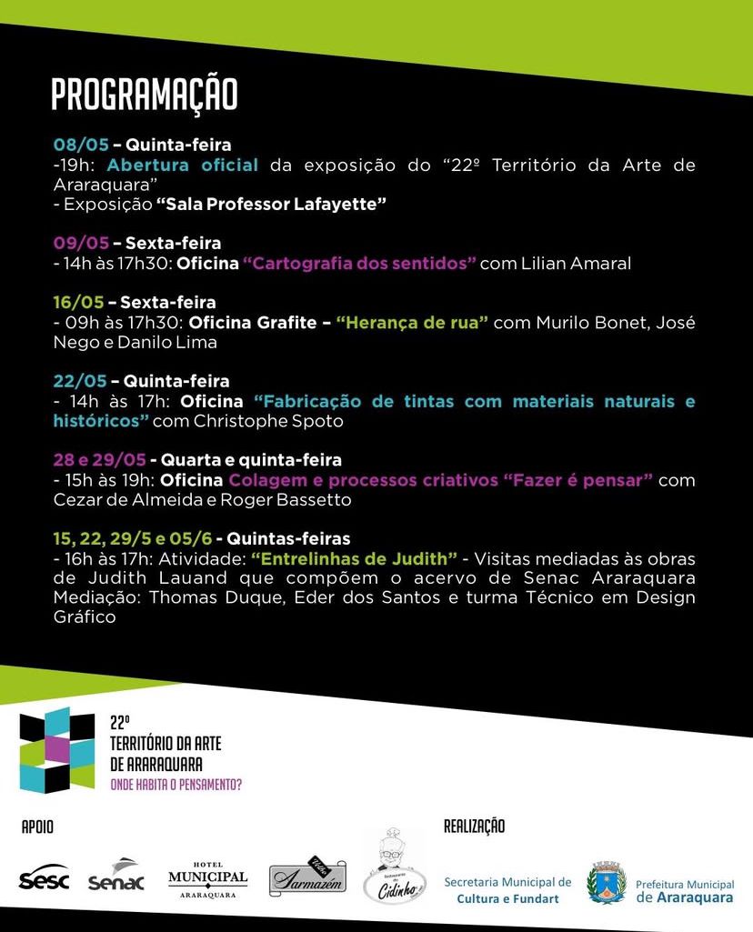 Vale destacar que Araraquara realiza nesta quinta-feira (08) a abertura do 22º Território da Arte, com cerimônia às 19h no Teatro Municipal Prefeito Clodoaldo Medina – o evento também homenageia o Dia do Artista Plástico e apresenta uma noite de múltiplas expressões artísticas, reunindo exposição, música e teatro. Os apoiadores culturais do evento são: Sesc Araraquara, Senac Araraquara, Hotel Municipal, Velho Armazém e Restaurante do Cidinho.