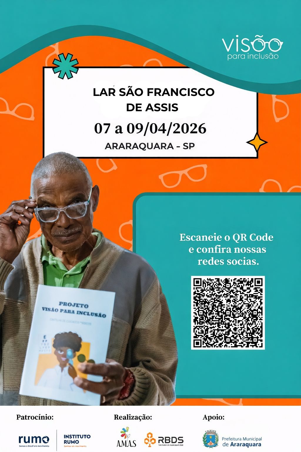 A Prefeitura de Araraquara, por meio da Secretaria de Desenvolvimento Social, em parceria com o Instituto Rumo e a Rede Brasileira de Desenvolvimento Social, promove o projeto “Visão para Inclusão”. São 320 vagas para pessoas idosas ou pessoas com deficiência em situação de vulnerabilidade social, que poderão realizar exame optométrico para detectar a necessidade do uso de óculos. Posteriormente, para os que precisarem, haverá a entrega dos óculos sem custo. Os atendimentos acontecerão entre os dias 7 e 9 de abril no Lar São Francisco de Assis. Para se inscrever, o munícipe precisa procurar o CRAS de referência da região onde mora a partir desta segunda-feira (23).