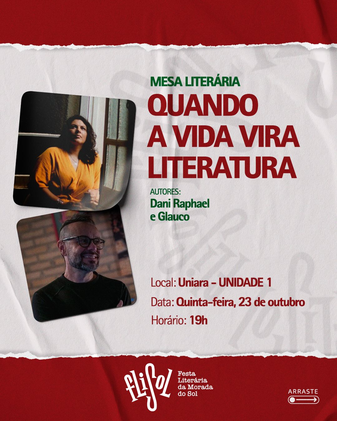 O ciclo de conversas do Esquenta FliSol – Festa Literária da Morada do Sol segue nesta quinta-feira, 23 de outubro, com a mesa “Quando a Vida Vira Literatura”, às 19 horas, na Uniara – Unidade 1. O encontro reúne os escritores Dani Raphael e Glauco Keller em um bate-papo sobre as múltiplas formas de transformar vivências, emoções e experiências reais em narrativas literárias.