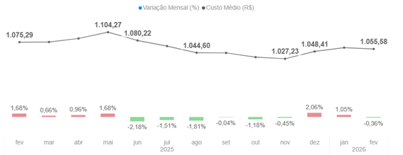 Gráfico 1 – Evolução do custo médio e variação mensal da cesta básica em Araraquara – fevereiro/2025 a fevereiro/2026
