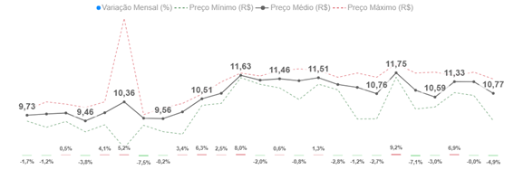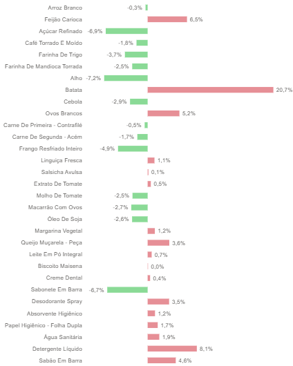 Entre os itens, as maiores altas foram observadas na batata (+20,7%), detergente líquido (+8,1%) e feijão carioca (+6,5%), seguidos por ovos brancos (+5,2%) e sabão em barra (+4,6%). Já as principais quedas ocorreram no alho (-7,2%), açúcar refinado (-6,9%), sabonete (-6,7%), frango (-4,9%) e farinha de trigo (-3,7%).