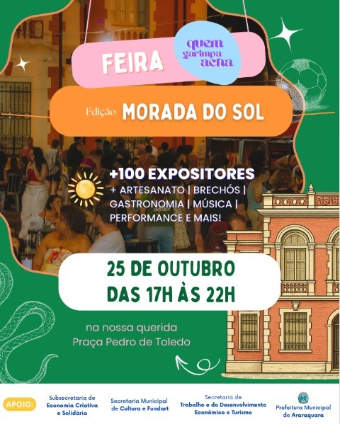 Nesta homenagem à querida Araraquara, a feira apresenta mais de 100 expositores de artesanato, brechó, gastronomia, decoração – entre outros, em uma realização do Coletivo Quem Garimpa Acha, com apoio da Secretaria de Trabalho e do Desenvolvimento Econômico e do Turismo, via Subsecretaria de Economia Criativa e Solidária. Ainda: a programação conta com música, performance, e detalhes pensados com carinho para mostrar um pouco do que Araraquara oferece.