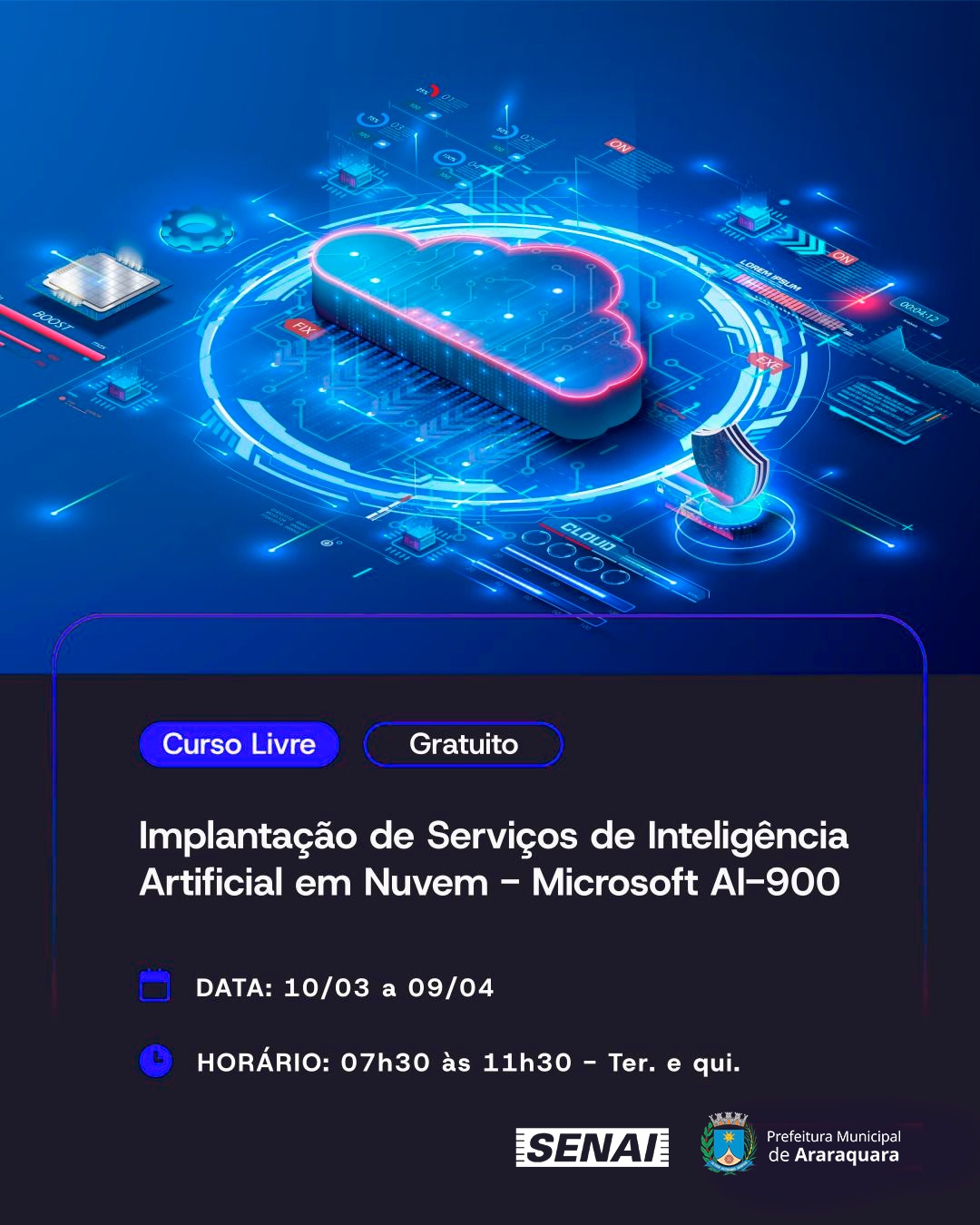 A Prefeitura de Araraquara, em parceria com o Serviço Nacional de Aprendizagem Industrial (SENAI), está com matrículas abertas para o curso Implantação de Serviços de Inteligência Artificial em Nuvem – Microsoft AI-900. A formação é gratuita e voltada a quem já possui conhecimentos básicos de informática, adquiridos em cursos, no trabalho ou de forma autodidata.