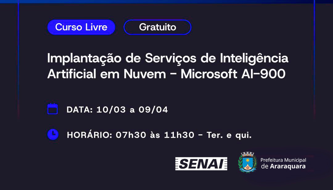 A Prefeitura de Araraquara, em parceria com o Serviço Nacional de Aprendizagem Industrial (SENAI), está com matrículas abertas para o curso Implantação de Serviços de Inteligência Artificial em Nuvem – Microsoft AI-900. A formação é gratuita e voltada a quem já possui conhecimentos básicos de informática, adquiridos em cursos, no trabalho ou de forma autodidata.