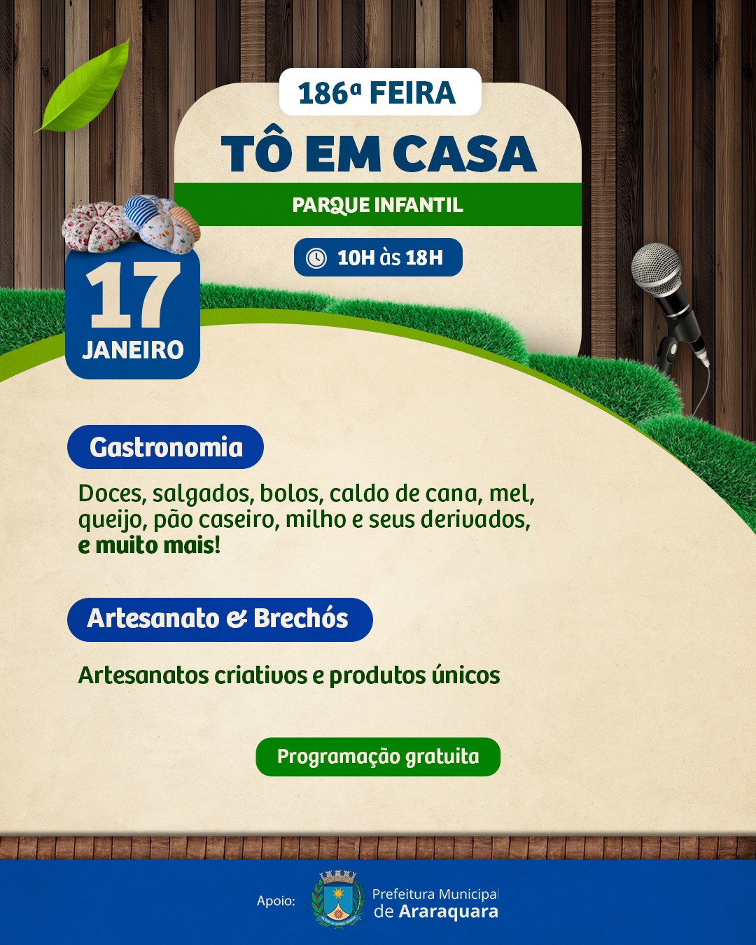 A feira é realizada pelo Coletivo Tô em Casa, com apoio da Prefeitura de Araraquara, por meio da Secretaria Municipal de Desenvolvimento Econômico, via Subsecretaria do Trabalho e da Economia Criativa e Solidária.