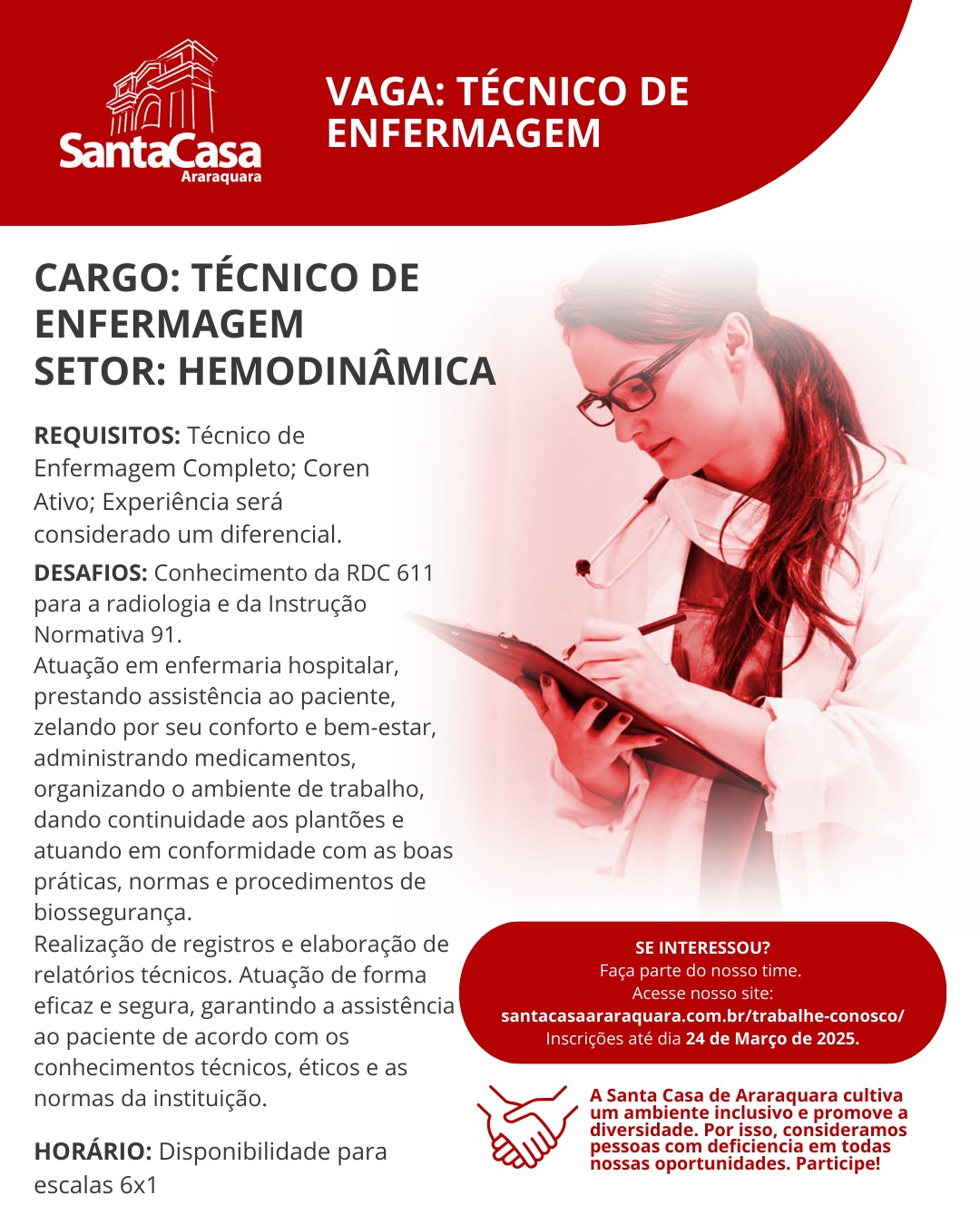 A Santa Casa de Misericórdia de Araraquara está com vagas abertas para o cargo de técnico de enfermagem para o setor de hemodinâmica. Os requisitos para a conquista do cargo é ter o curso de técnico de enfermagem completo, estar com o COREN ativo e experiência será considerado um diferencial.