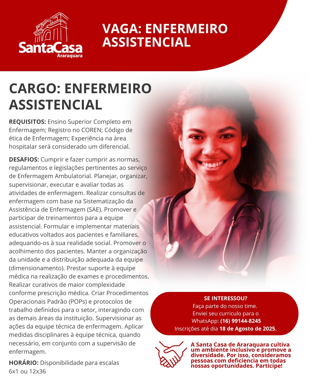 A Santa Casa de Misericórdia de Araraquara está com vagas abertas para o cargo de enfermeiro assistencial. O horário de trabalho é ter disponibilidade para escalas 6X1 e 12×36.