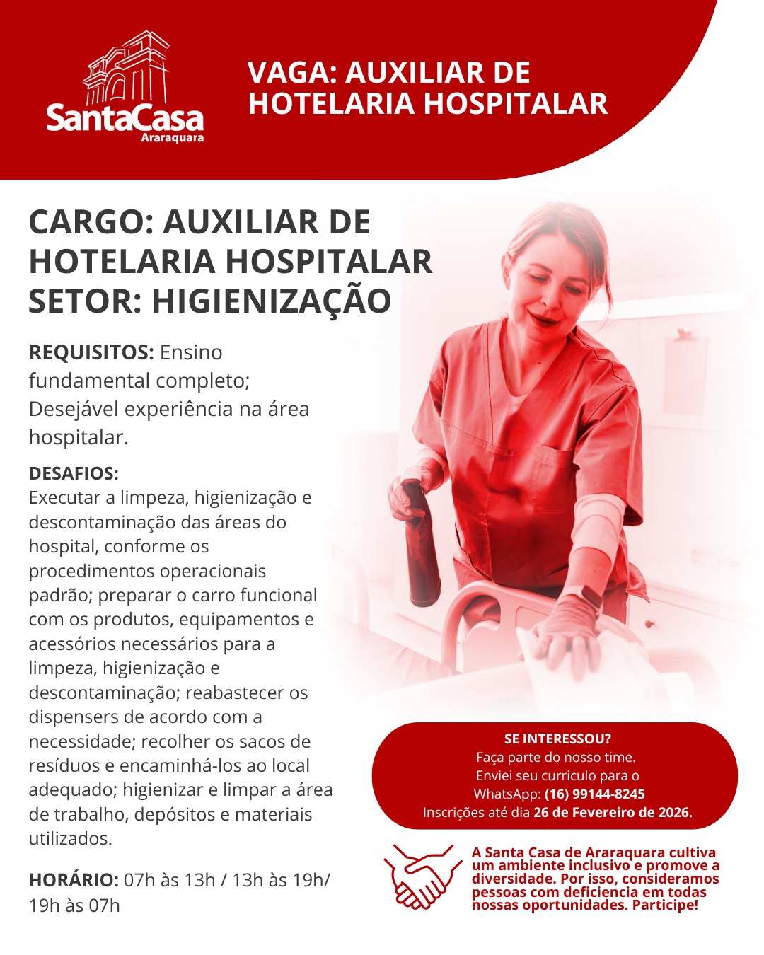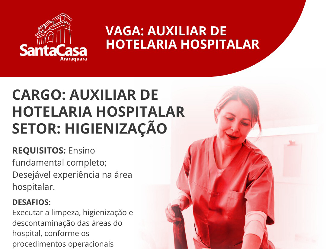 A Santa Casa de Misericórdia de Araraquara está com vagas abertas para o cargo auxiliar de hotelaria hospitalar para o setor de higienização. Os horários de trabalho das 07h às 13h/ das 13h às 19h/ das 19h às 07h.