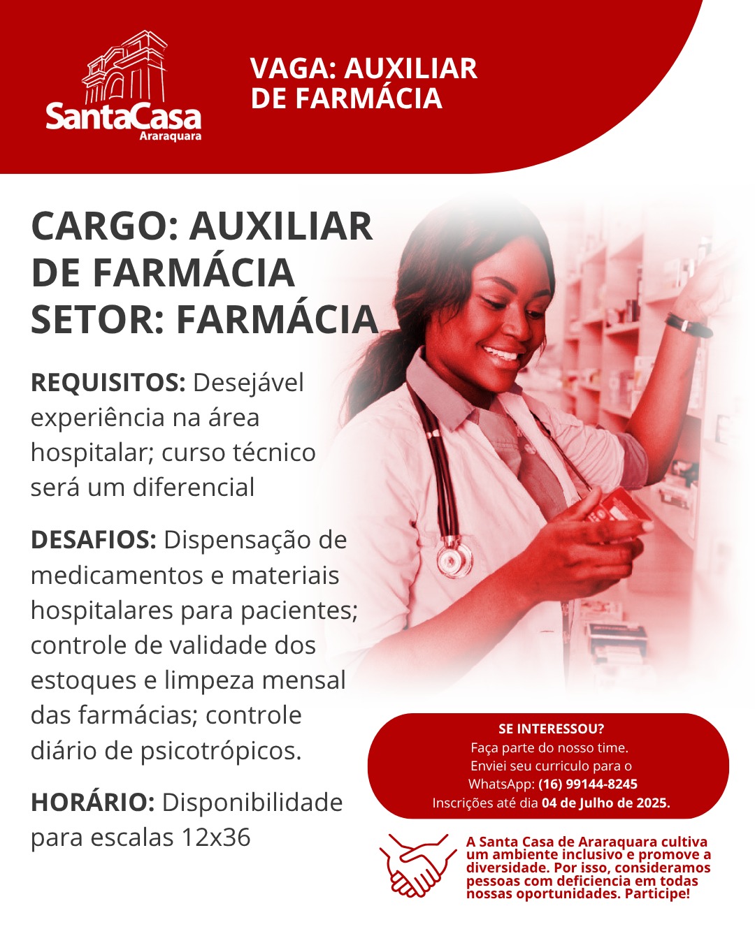 A Santa Casa de Misericórdia de Araraquara está com vagas abertas para o cargo de auxiliar de enfermagem para o setor de farmácia. Os requisitos para a conquista do cargo é desejável experiência na área hospitalar; curso técnico será um diferencial.