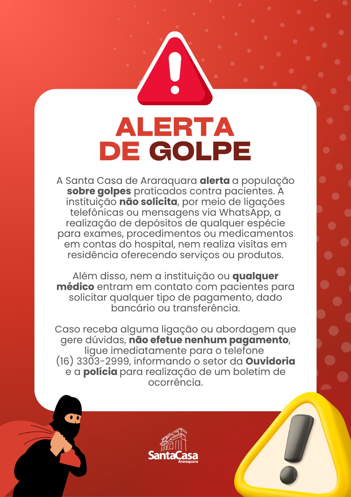 A Santa Casa de Misericórdia de Araraquara alerta à população de Araraquara e região sobre a ocorrência de golpes praticados em nome da instituição, tendo como alvo pacientes e familiares.