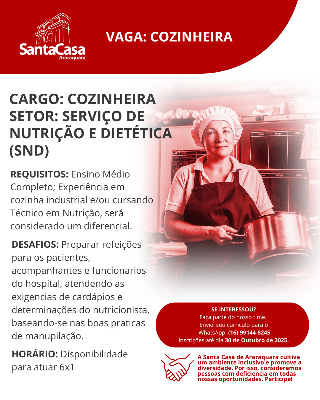 A Santa Casa de Araraquara está com vaga aberta para cozinheira do setor de Serviço de Nutrição e Dietética (SND) da instituição.