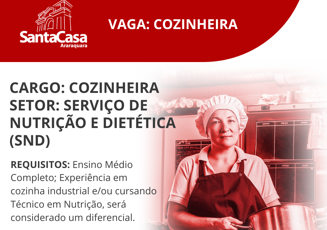 A Santa Casa de Araraquara está com vaga aberta para cozinheira do setor de Serviço de Nutrição e Dietética (SND) da instituição.