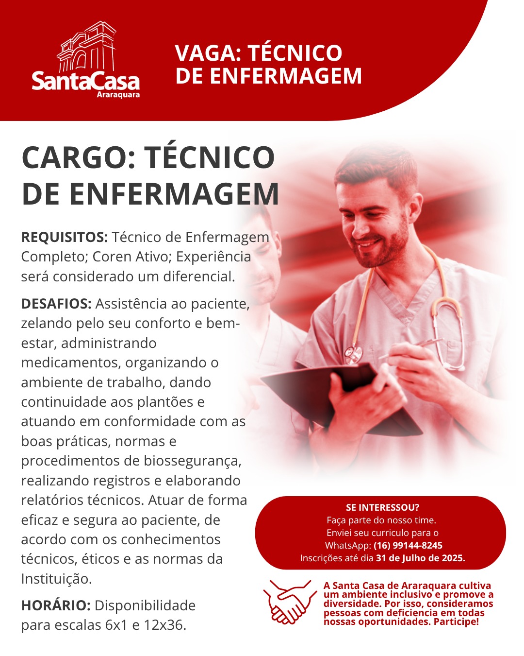 A Santa Casa está com vagas abertas para o cargo de técnico de enfermagem. O horário de trabalho é ter disponibilidade para escalas 6X1 e 12×36.