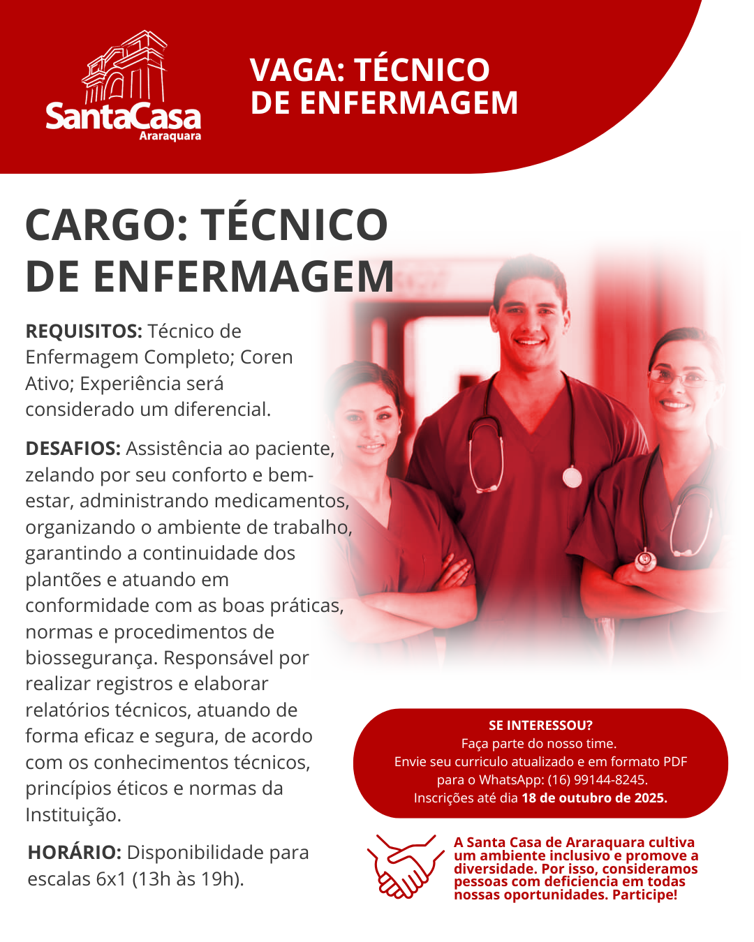 A Santa Casa de Araraquara está com vaga aberta para Técnico de Enfermagem, oferecendo a oportunidade de fazer parte de uma equipe comprometida com a qualidade da assistência e o cuidado humanizado aos pacientes.
