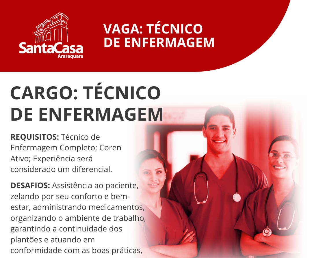 A Santa Casa de Araraquara está com vaga aberta para Técnico de Enfermagem, oferecendo a oportunidade de fazer parte de uma equipe comprometida com a qualidade da assistência e o cuidado humanizado aos pacientes.