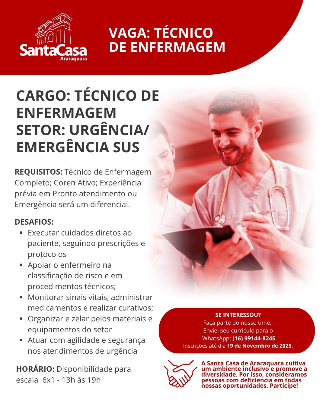 Os currículos atualizados e em formato PDF podem ser enviados até o dia 19 de novembro através do WhatsApp (16) 99144-8245 do setor de recrutamento e seleção, com o título técnico de enfermagem.