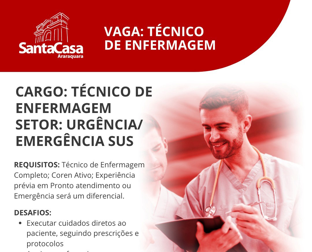 A Santa Casa está com vagas abertas para o cargo de técnico de enfermagem para o setor de urgência e emergência.