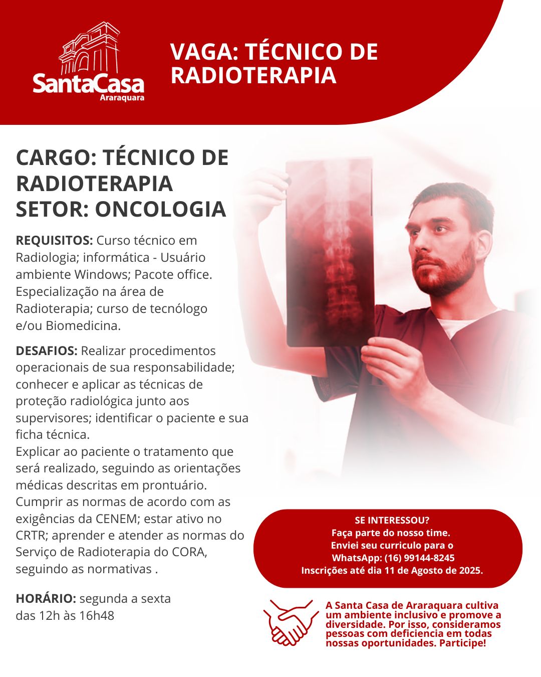A Santa Casa de Misericórdia de Araraquara está recebendo currículos para o cargo de técnico em radiologia para o setor de oncologia.
