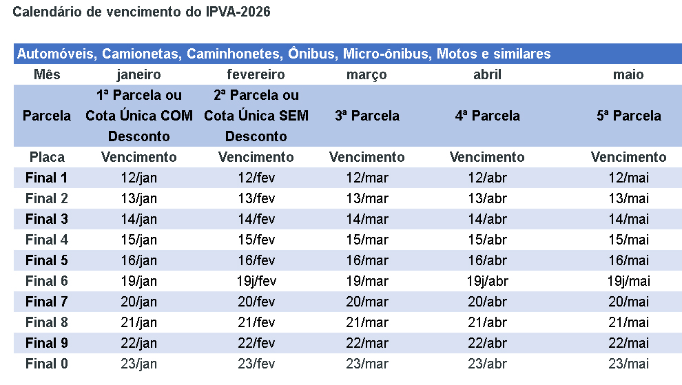 Os proprietários poderão escolher entre as seguintes formas de pagamento com vencimentos de acordo com o final de placa do veículo: