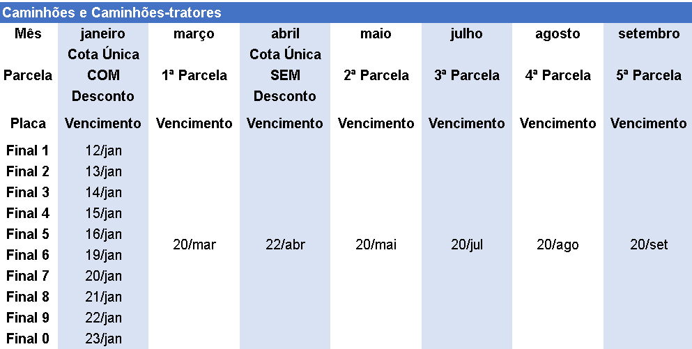 Os caminhões têm prazos diferenciados: para o pagamento integral em janeiro é concedido desconto de 3%; aos que escolherem pagar em cota única, sem desconto, é 22 de abril. Para os proprietários que optarem pelo parcelamento em três, quatro ou cinco vezes, sem desconto, os vencimentos são em 20 de março, 20 de maio, 20 de julho, 20 de agosto e 20 de setembro.