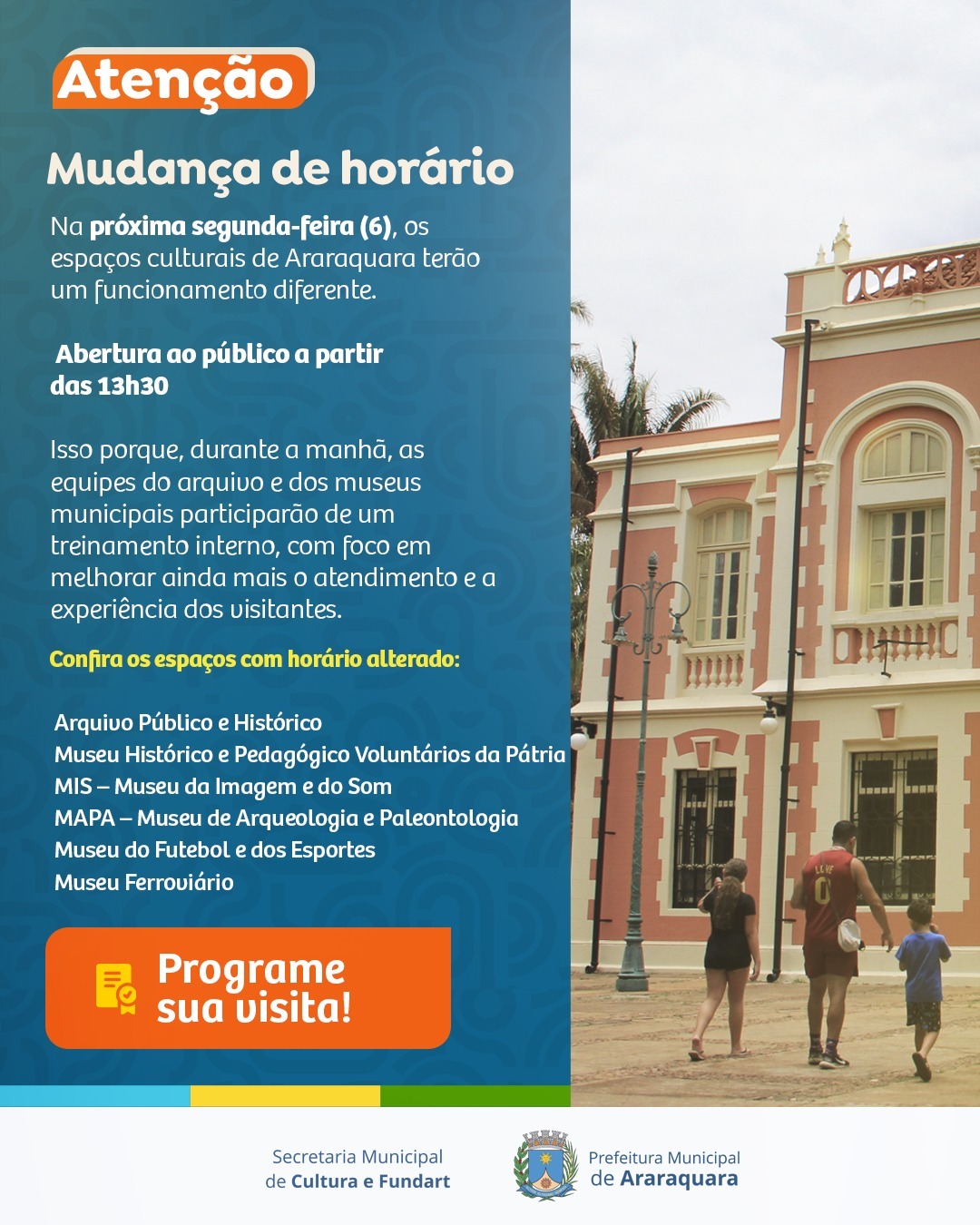 De acordo com a Secretaria Municipal de Cultura e Fundart, o horário vale para os seguintes espaços: Arquivo Público e Histórico Prof. Rodolpho Telarolli, Museu Histórico e Pedagógico Voluntários da Pátria, MIS – Museu da Imagem e do Som Maestro José Tescari, MAPA – Museu de Arqueologia e Paleontologia de Araraquara, Museu do Futebol e dos Esportes de Araraquara e Museu Ferroviário Francisco Aureliano de Araújo.