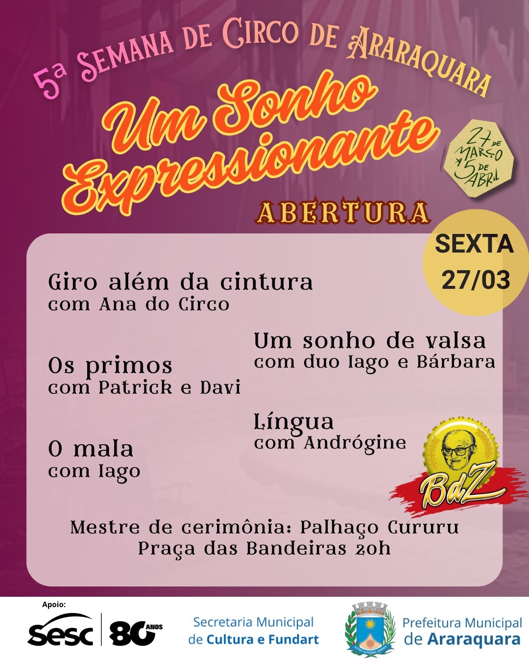 A abertura acontece no dia que é comemorado o Dia do Circo, 27 de março, às 20h, na Praça das Bandeiras, com “Um Sonho Expressionante”, espetáculo composto por artistas locais selecionados via edital. Com o mestre de cerimônia Palhaço Cururu, a abertura contará com as seguintes apresentações: “Giro além da cintura”, com Ana do Circo; “Um sonho de valsa”, com duo Iago e Bárbara; “Os primos”, com Patrick e Davi; “Língua”, com Andrógine; e “O mala”, com Iago.