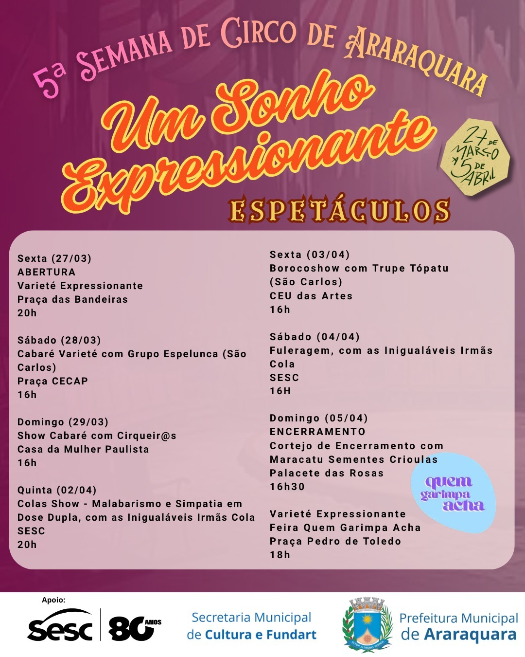 - ABERTURA dia 27/3 (sexta-feira), às 20h, com “Um Sonho Expressionante”, (espetáculo com diversos artistas locais)