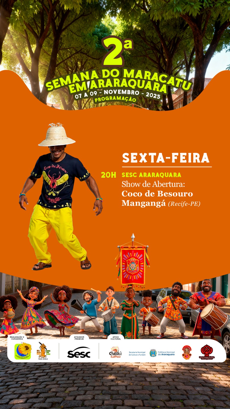 Na sexta-feira, 7 de novembro, será realizada a abertura da 2ª Semana do Maracatu de Araraquara no Sesc Araraquara, às 20h, com o show de “Coco de Besouro Mangangá”, grupo pernambucano de Recife que traz para o palco a força dos tambores e o canto das tradições afro-brasileiras. A entrada é gratuita, sem necessidade de retirada de ingressos prévia, basta chegar e participar!