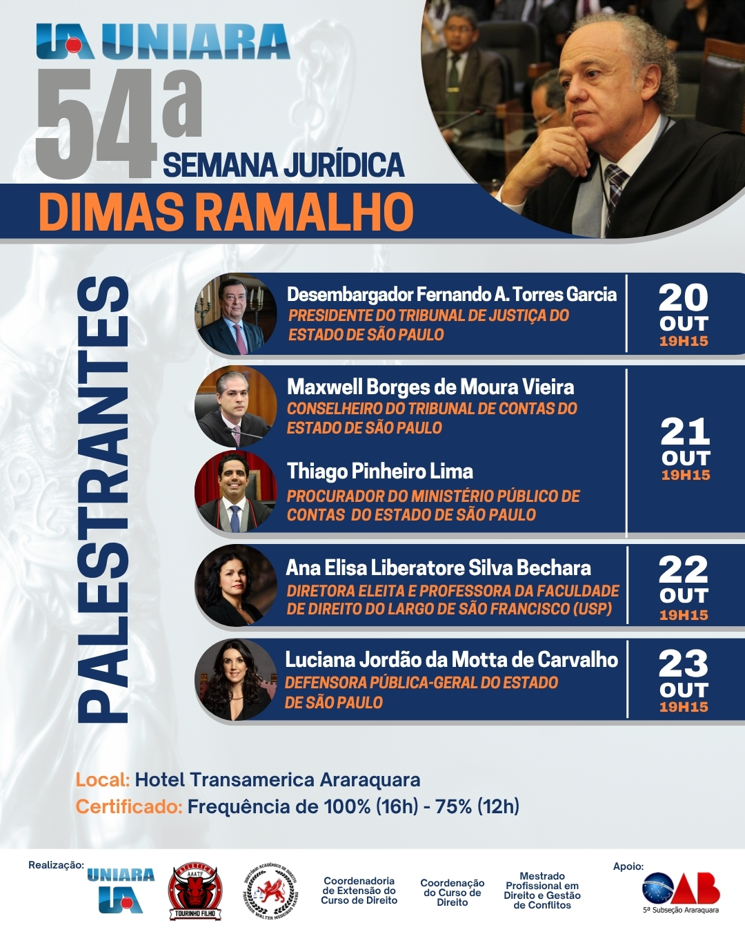 A Universidade de Araraquara (UNIARA) realizará, entre os dias 20 e 23 de outubro, a 54ª edição de sua semana jurídica, um dos eventos mais tradicionais do calendário acadêmico da região. Neste ano, o homenageado será o Conselheiro e atual Vice-Presidente do Tribunal de Contas do Estado de São Paulo, Dimas Ramalho.