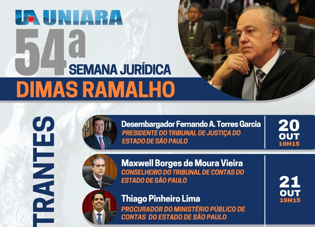 A Universidade de Araraquara (UNIARA) realizará, entre os dias 20 e 23 de outubro, a 54ª edição de sua semana jurídica, um dos eventos mais tradicionais do calendário acadêmico da região. Neste ano, o homenageado será o Conselheiro e atual Vice-Presidente do Tribunal de Contas do Estado de São Paulo, Dimas Ramalho.