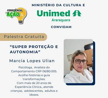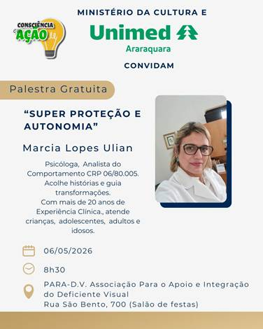 Na próxima semana, em 6 de maio (quarta-feira), o projeto educativo e cultural Consciência em Ação promove mais uma palestra gratuita na cidade de Araraquara. O tema da vez é “Superproteção e Autonomia”, conduzido pela psicóloga Marcia Lopes Ulian. A apresentação ocorrerá às 8h30, na PARA-D.V. (Associação para o Apoio e Integração do Deficiente Visual), e qualquer pessoa interessada no assunto pode acompanhar a discussão. As vagas são limitadas, até o preenchimento total do espaço.