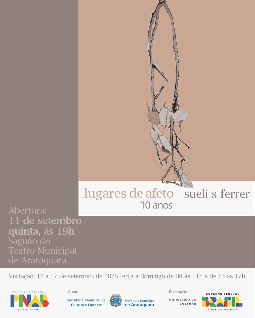 Também às 19 horas, o público poderá prestigiar a abertura da exposição “Lugares de Afeto”, da artista visual Sueli S. Ferrer, no Teatro Municipal de Araraquara. A mostra apresenta uma retrospectiva dos últimos dez anos de sua produção, incluindo duas obras inéditas que integram a Trilogia dos Jardins (2025).