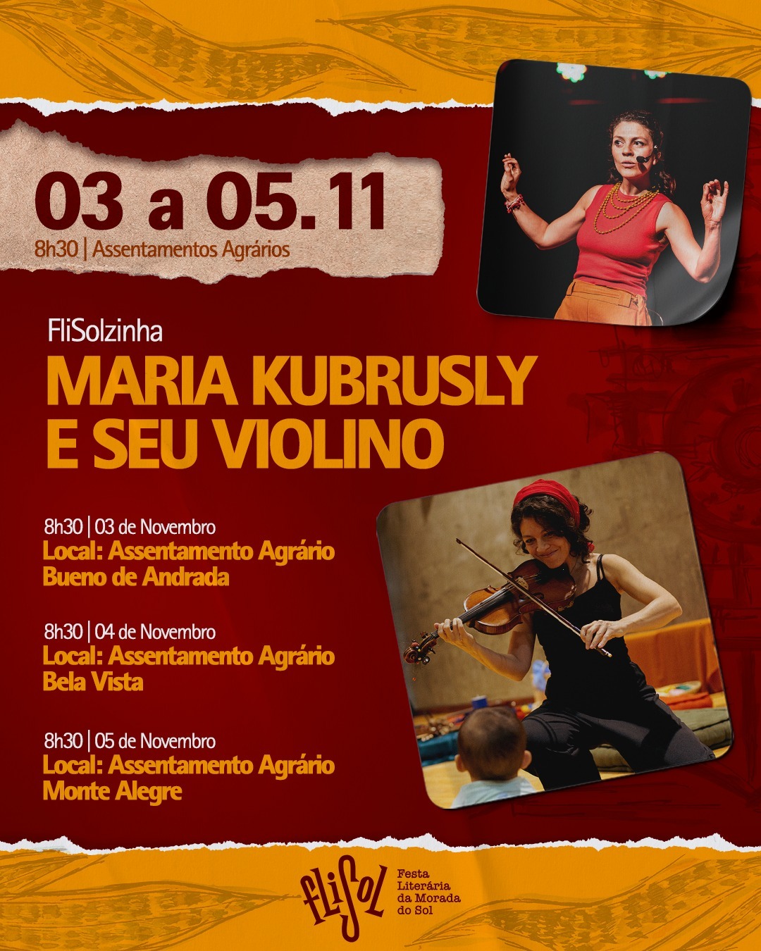 Com Maria Kubrusly e seu violino, cada acorde se transforma em história e cada história, em sonho compartilhado. As apresentações musicais integram a programação da FliSolzinha, série de encontros que antecede a 4ª edição da FliSol – Festa Literária da Morada do Sol.