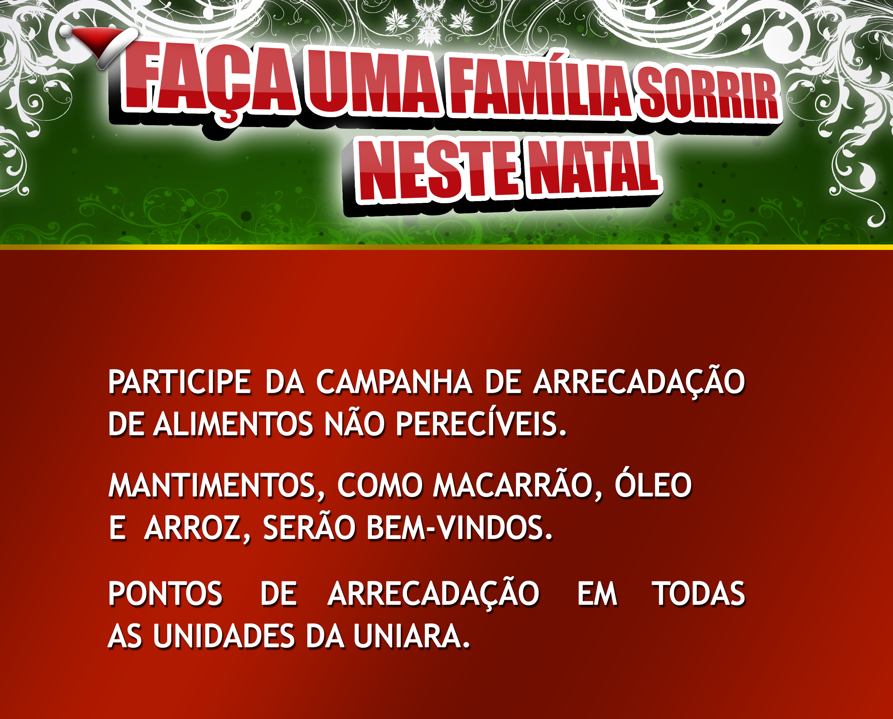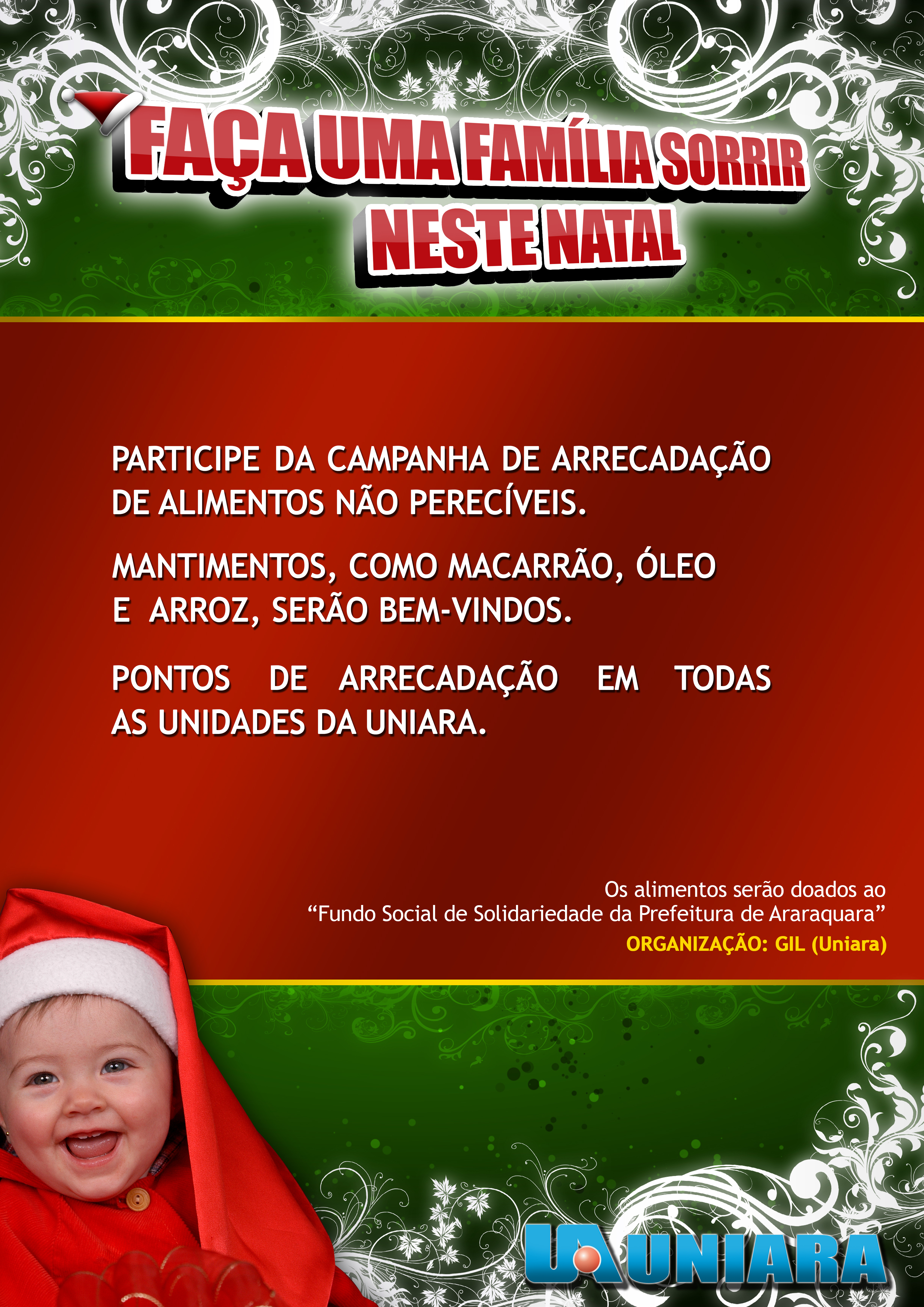 A Universidade de Araraquara – Uniara deu início em mais uma Campanha de Natal “Faça uma família sorrir neste Natal”, por meio do inspetor de alunos, Gildázio da Silva Rêgo, o Gil. A iniciativa visa a arrecadar mantimentos que serão destinados às famílias carentes atendidas pelo Fundo Social de Solidariedade do município. Os interessados podem entregar suas doações em quaisquer unidades da instituição.