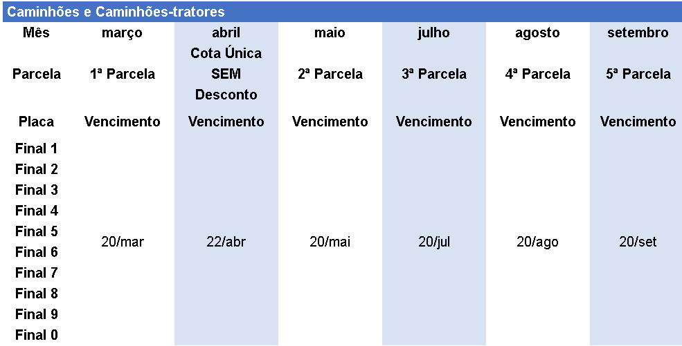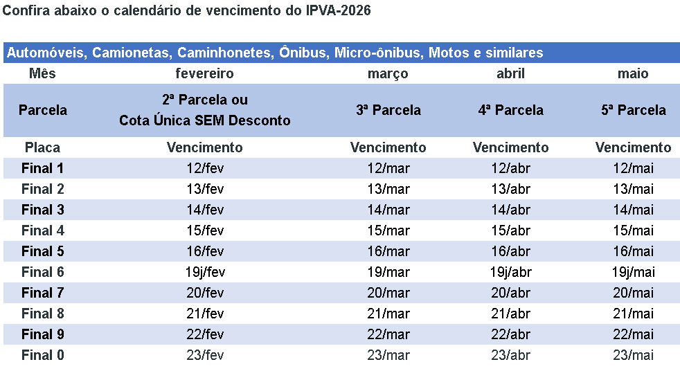 O calendário das placas 7, 8, 9 e 0 segue do dia 20 a 23 de fevereiro (confira a tabela abaixo). Caso o vencimento ocorra em finais de semana ou feriados, o pagamento poderá ser feito no próximo dia útil.