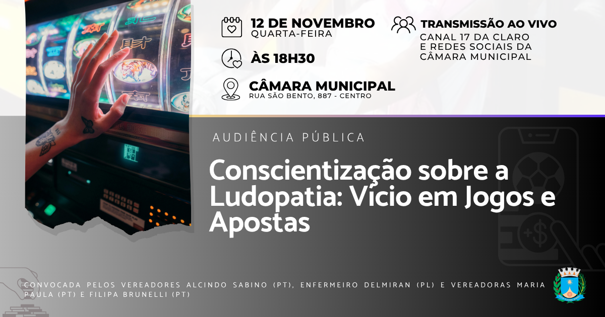 O vício em jogos e apostas, conhecido como ludopatia, será o assunto da Audiência Pública que acontecerá nesta quarta-feira (12), a partir das 18h30, no Plenário da Câmara. A iniciativa faz parte das atividades do “Dia Municipal de Conscientização sobre a Ludopatia”.