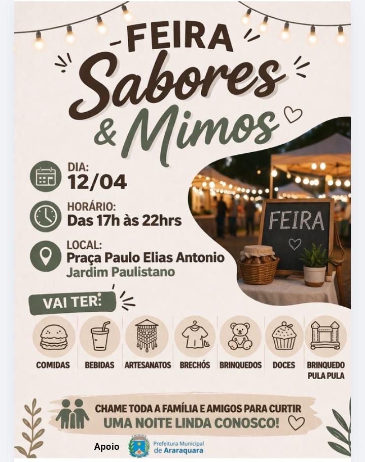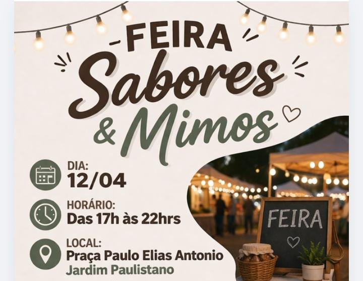 Neste domingo, 12 de abril, a feira “Sabores & Mimos” é destaque na Praça Paulo Elias Antonio, das 17h às 22h, com o apoio da Secretaria Municipal de Desenvolvimento Econômico, via Subsecretaria do Trabalho e da Economia Criativa e Solidária. Com início às 18h, a feira segue com programação gratuita até às 22h.